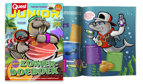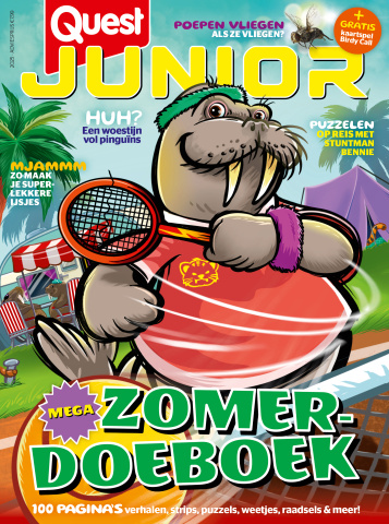 Vakantie wordt nóg leuker met… het Mega ZomerDoeboek van Quest Junior. Daarmee hoef je je geen seconde te vervelen! Lukt het jou om alle puzzels op te lossen? We hebben er extra veel voor je verzameld. Maar pas op: als je begint, wil je er nóg eentje doen. En nóg eentje. Van al dat puzzelen krijg je lekkere trek. Tijd om zelf ijsjes te maken. Wij laten zien hoe je dat doet, het is echt supermakkelijk. (En je ouders zeggen vast geen nee als je vraagt of het mag.) Natuurlijk geven we antwoord op de gekste vragen. Poepen vliegen bijvoorbeeld als ze vliegen? Kunnen vissen achteruit zwemmen? En dat is lang niet alles. Ben je gek op strips en moppen? Die staan er ook in. Net als grappige weetjes. Wist jij bijvoorbeeld dat er een woestijn is vol pinguïns? Slimme trucs hebben we ook nog voor je. Bijvoorbeeld: het weer voorspellen. En kleuren zonder stiften of potloden. Fijne zomer!