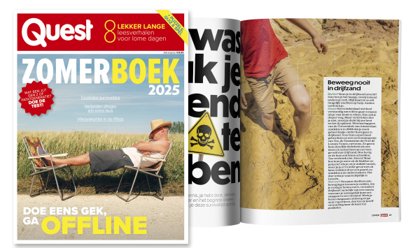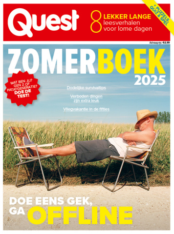 Quest daagt je uit: leg die slimme telefoon weg en verlies je in dit slimme staaltje analoge technologie. Want het Quest Zomerboek is een vernuftig samenspel van papier, inkt, lijm, creativiteit en kennis: waar vind je dat nog? Gegarandeerd trilfunctievrij, en boordevol extra lange leesverhalen waar je ongestoord de tijd voor kunt nemen. Houd pen en brein bij de hand voor de Grote Generatietest en een katern vol puzzels. Of speel het uitneembare kaartspel. Het Quest Zomerboek biedt kortom genoeg om je een zomer lang offline te vermaken. En wie weet, maakt het je nog een beetje slimmer ook.